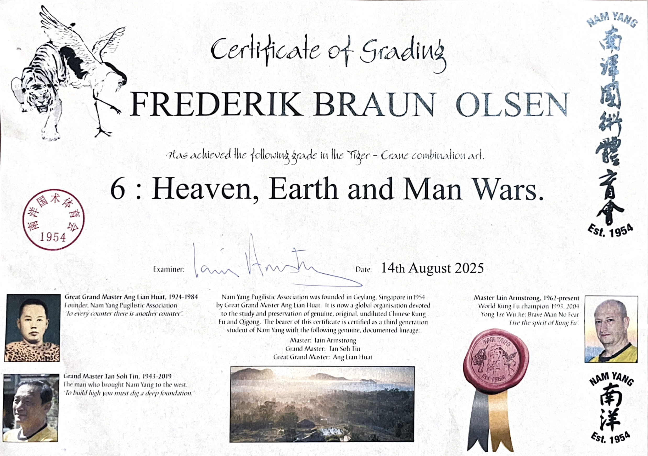 På 1400 timer har Frederik gradueret sig op på det 6 niveau af Nam Yang Kung Fu