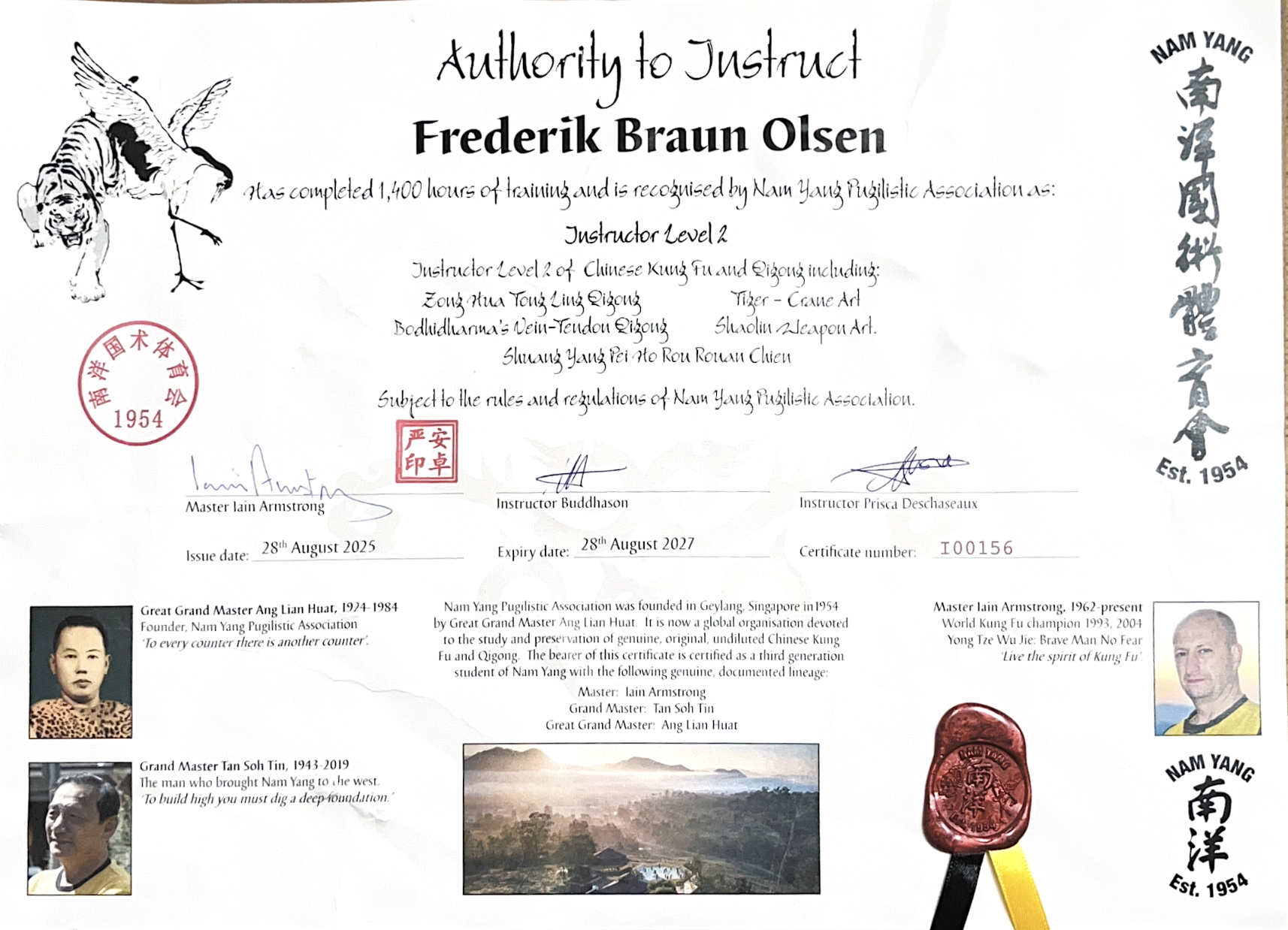 Frederik er uddannet instruktør i Kung Fu og Qi Gong og har gennemført mere end 1400 timers undervisning og træning i Thailand. I to perioder, i 2023 og 2025, har han boet og undervist på Nam Yangs største Kung Fu-skole, hvor han har fordybet sig i både selve kunsten samt undervisning og formidling af Kung Fu og Qi Gong.