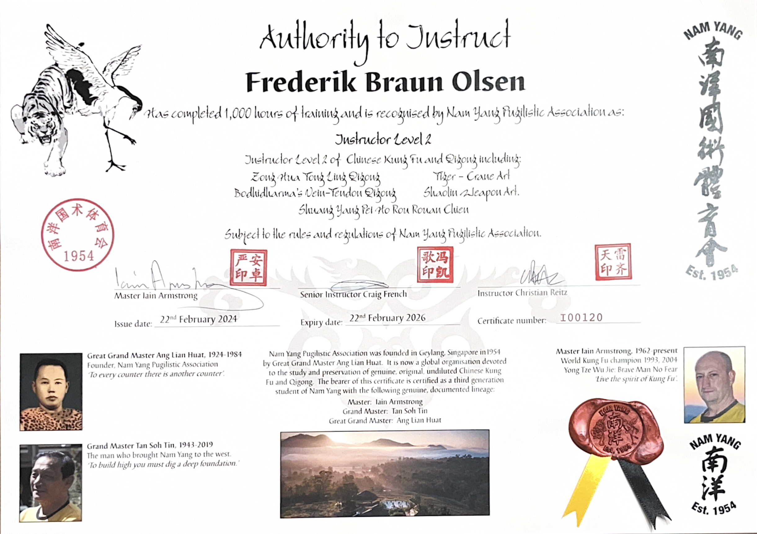 Frederik er underviser hos Nam Yang Lyngby og formand for foreningen. Han bidrager til undervisningen med både international erfaring og en dyb faglig forankring i Nam Yang Kung Fu.