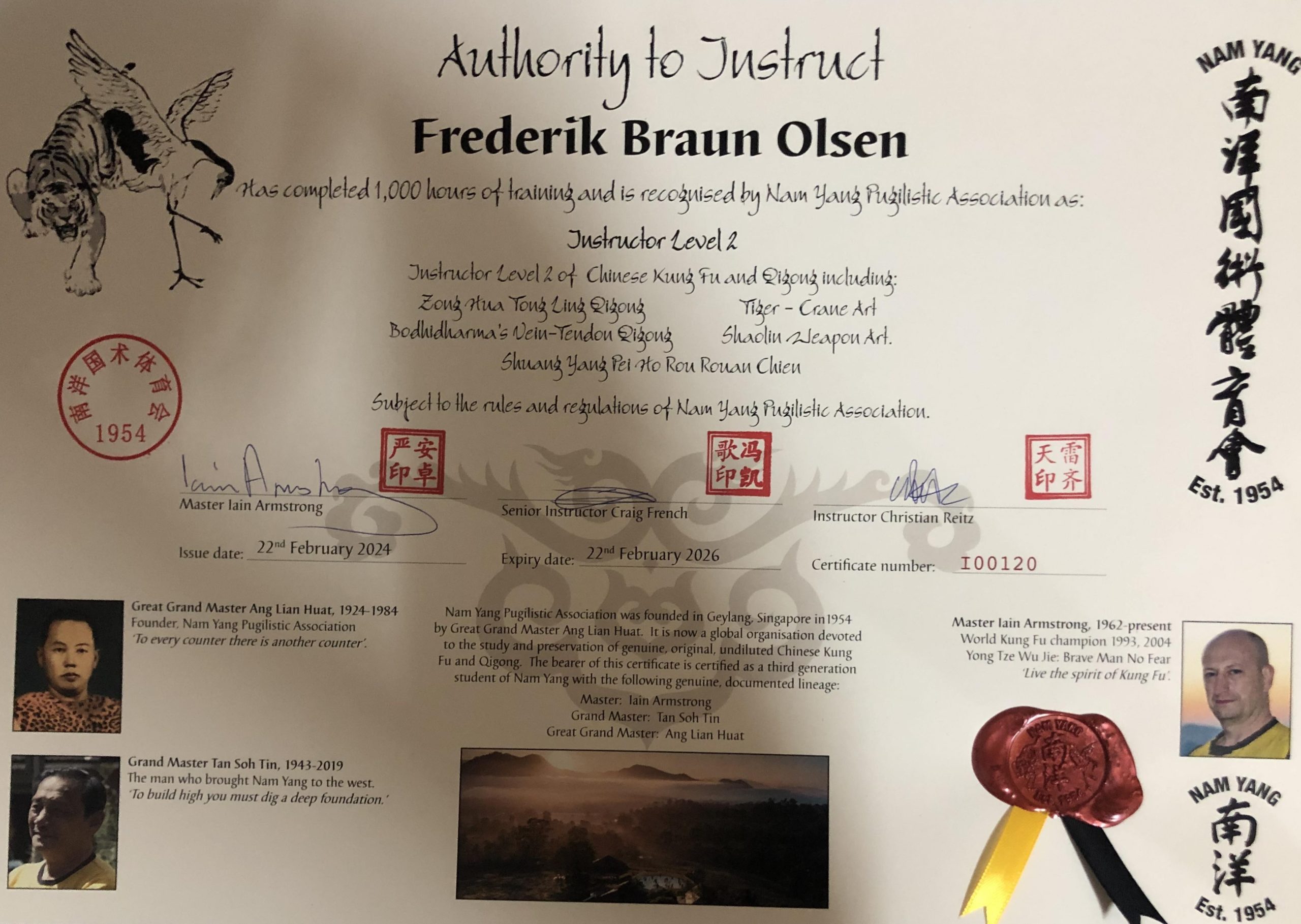 I 2023 færdiggjorde Frederik sin uddannelse som Kung fu Instruktør, og fik dertil et certifikat til at undervise Nam Yang på basisniveau