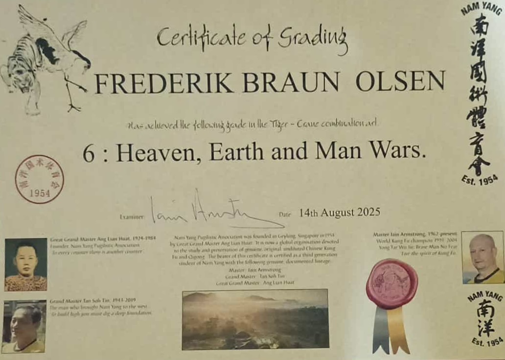 På 1400 timer har Frederik gradueret sig op på det 6 niveau af Nam Yang Kung Fu
