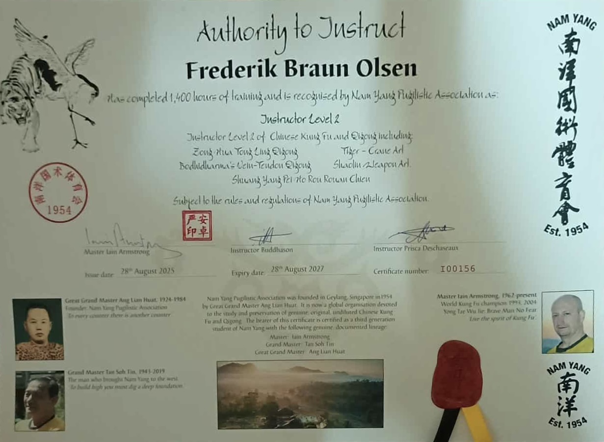 Frederik er uddannet instruktør i Kung Fu og Qi Gong og har gennemført mere end 1400 timers undervisning og træning i Thailand. I to perioder, i 2023 og 2025, har han boet og undervist på Nam Yangs største Kung Fu-skole, hvor han har fordybet sig i både selve kunsten samt undervisning og formidling af Kung Fu og Qi Gong.
